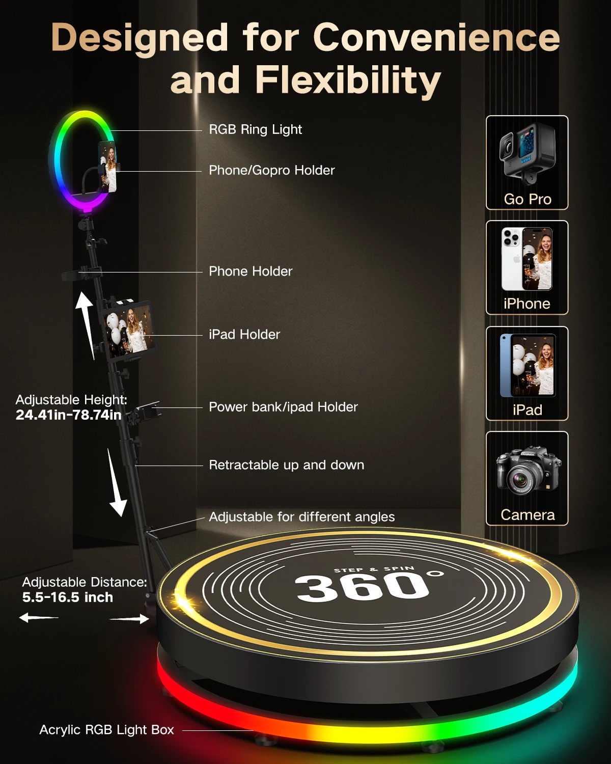 Turn every event into a share-worthy moment with the Kemaituo 360 Photo Booth Machine RGB Ring Light.