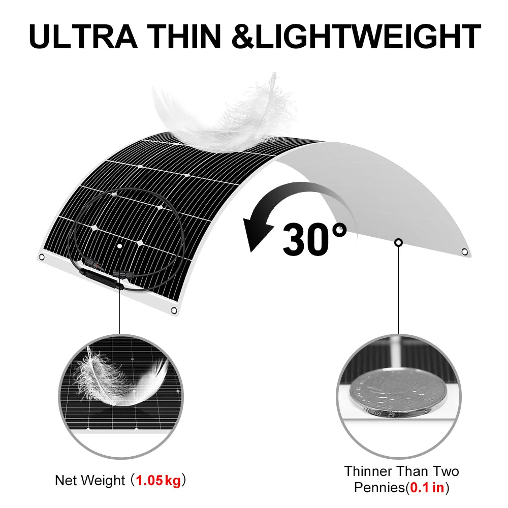- Flexible, non-folding surface lets you mount it on curved roofs or irregular surfaces without sacrificing performance, even on RVs, boats, or tents.