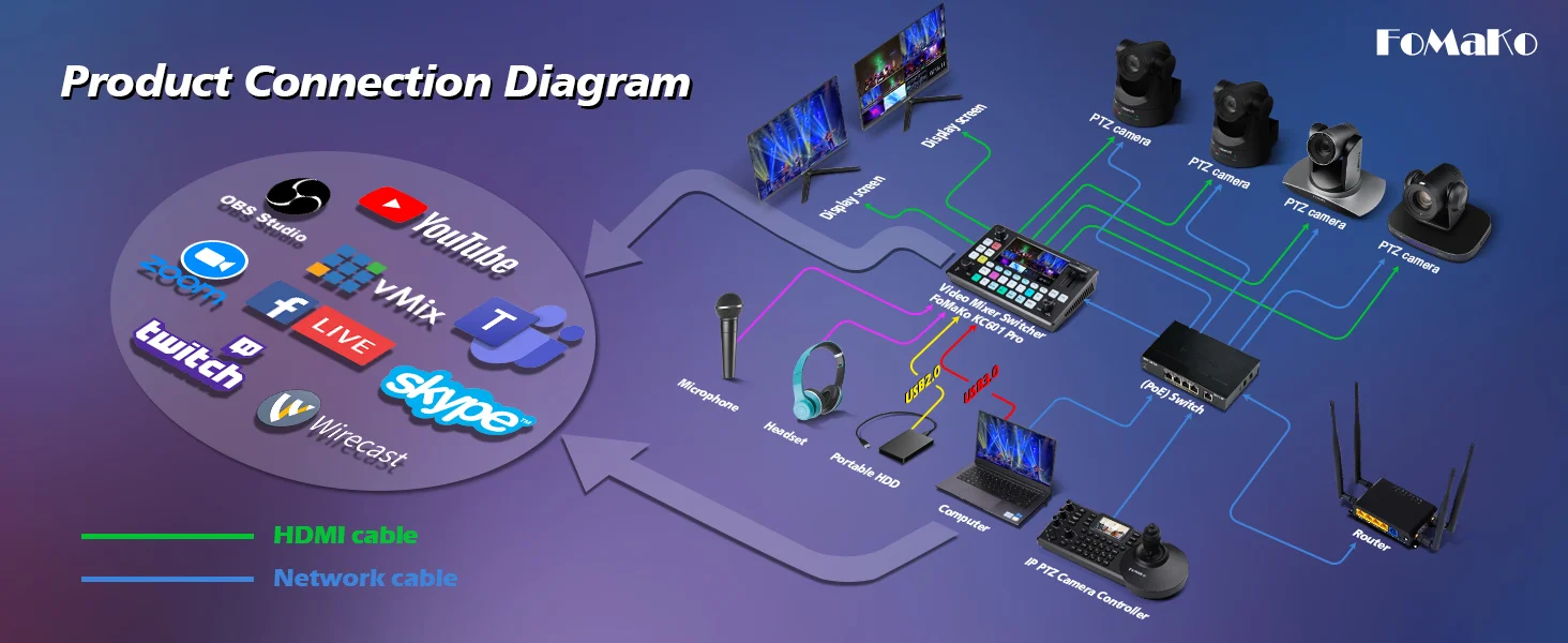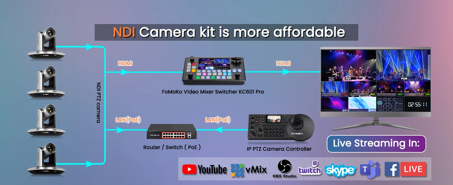FoMaKo NDI Camera AI Auto Tracking HDMI PTZ Camera 20x Optical Zoom(4pcs) +KC601 Video Mixer Switcher+ KC608N NDI PTZ Controller