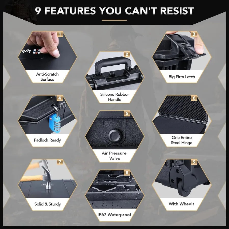 - Waterproof protection with a rugged exterior and secure sealing to guard your gear from rain, dust, and moisture. The dependable latches and reinforced corners help withstand rough handling in travel and on-site work.