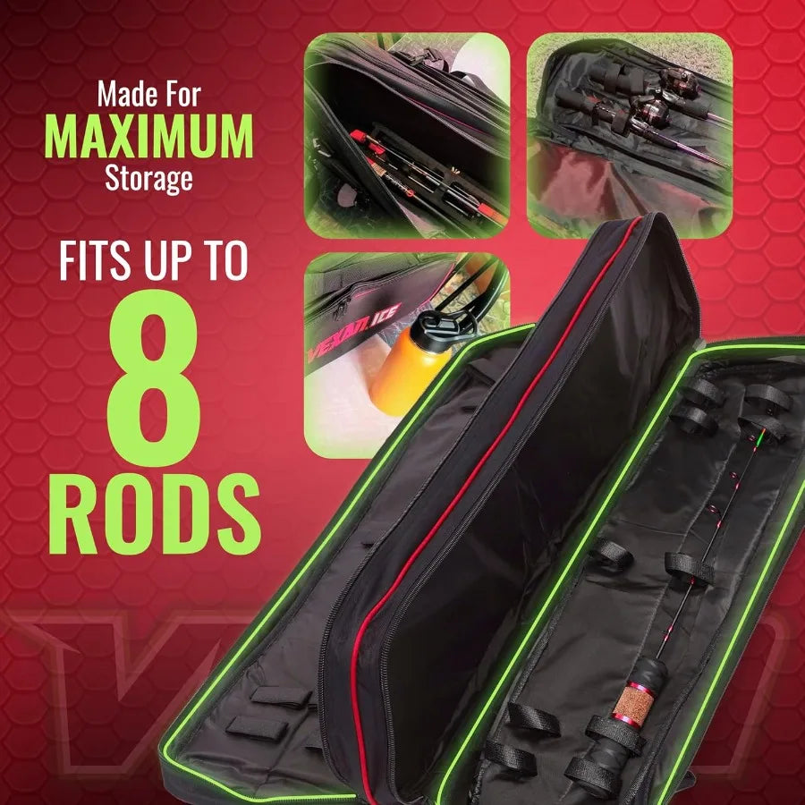 Ample Storage for 8 Rods: Securely holds up to 8 rod/reel combos for ice and fly fishing, with a double pocket and Velcro strapping system to prevent tangling and keep your gear organized.